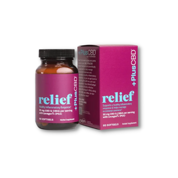 +PlusCBD Relief Softgels are doctor formulated with recovery supporting ingredients, including CBD, CBDA, and Levagen®+ (PEA). Relief softgels help address minor everyday soreness, support joint function, and encourage recovery following strenuous activity.*